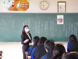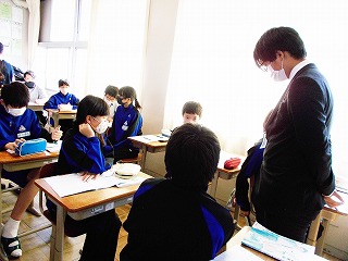 1年生で教育実習生さんによる「道徳」の授業がありました。『同じ病気で入院していた二人の女の子のうち、一人は治って退院できたが、もう一人の子は、松葉づえでの生活をすることに。町で松葉杖の女の子を見かけたとき、病気が治った女の子は隠れ、父が「話しかけてあげたら」と声をかけると、女の子は・・・』という話です。相手の気持ちを考えて行動することについて、「私だったら」と、自分に置き換えて考えていました。