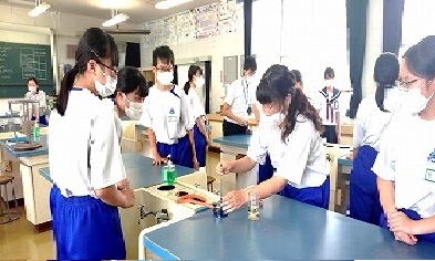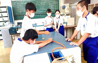 例年だと、夏休みですが今年は「夏の授業」が実施されています。理科の授業では「ガスバーナーの使い方」を理科室で行いました。まずは実験前に手洗いを済ませました。今回は、マッチを使用する実験ですが、今までマッチを使ったことがない生徒が多く、マッチで火をつけることに苦労している様子が見られました。また、ガスバーナーの調整が難しいようで、恐る恐るガスの量を調整していました。理科室にクーラーはありませんが、生徒たちは給水しながら、集中して実験に取り組んでいました。(1年通信「プラスワン」より)