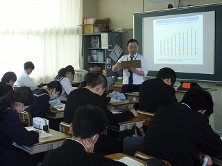 4時限目に各教室にて授業参観を、終了後、体育館にて学校説明会を行いました。大変多くの方にお越しいただきました。学校説明会では、校長あいさつの後、年間計画の説明、進路関係の説明と続き、最後に教職員の紹介をしました。保護者の皆様には、ご多用の中、お越しいただき、ありがとうございました。