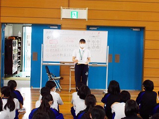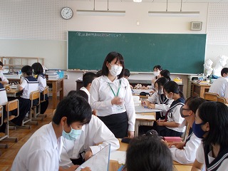 教育実習も3週間目に入りました。生徒の前に立って話す姿も板についてきました。本日は、3名に先生の授業がありました。保健体育では、バドミントンのドライブの打ち方を学び合い、美術では、トイレにサインしただけの作品が、アートとして「あり」か「なし」かを話し合い、道徳では、「礼儀って何だろう」と考える授業が行われました。