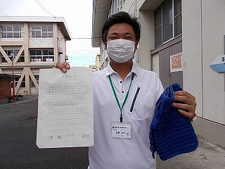 2年生のある女子生徒から「登校途中に突然の雨が降って来て、傘を持っていなかったので、髪の毛が濡れて歩いていると、北門のところにいた人が、タオルを貸してくれました」と、報告がありました。その後、PTAあいさつ運動に参加してくださった兵藤会長さんであることがわかり、お手紙付きでタオルをお返しすることができました。手紙の最後には「私もこれから他人に優しくしたいです」と書かれていました。