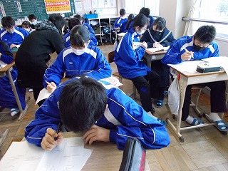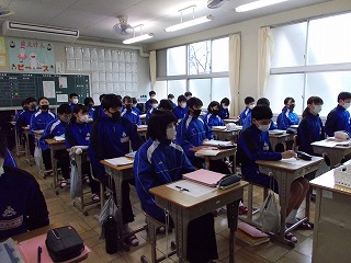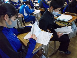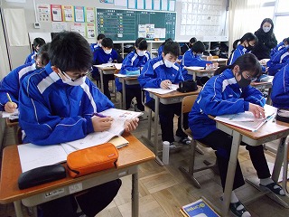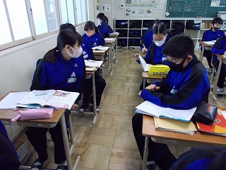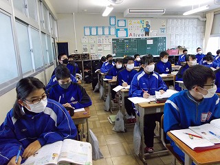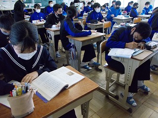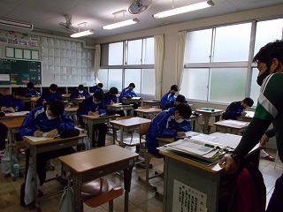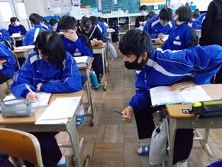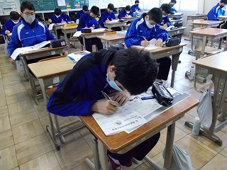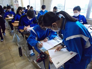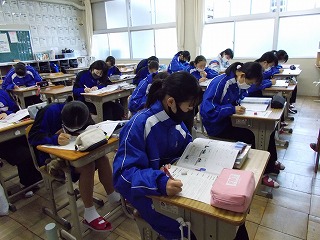 緊急事態宣言が愛知県でも出されるという状況ではありますが、3年生は、今週末から始まる後期第2回テストに向け、落ち着いた授業態度で取り組んでいます。2年生は、キャリア教育の中で高校調べを行ったり、1年生は、中学校の授業にも慣れ、ノートの取り方にも工夫が見られたりるするようになってきました。全員、全集中で取り組んでいます。感染症拡大が収まらない状況ではありますが、今一度、生活を見直し、活動も確認しながら取り組んでまいります。
