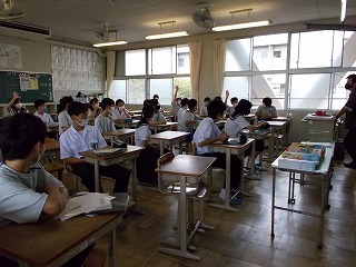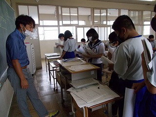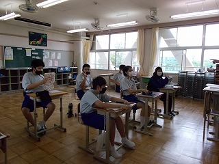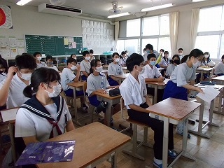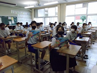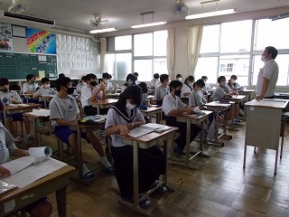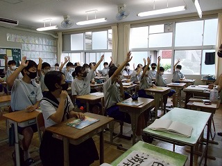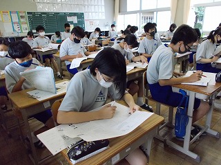 感染症の深刻な状況を考え、部活動については、今週から、校外・校内練習を行わないこととしましたが、本日の出校日については、どうするとよいか迷いました。しかし、メール等で、一方的な中止連絡だけでは真意は伝わらないと考えました。「子どもの感染も広がっていること、一人がかかっただけでは済まないこと、もう一度、自分の行動を見つめ直し、考え行動してほしいこと」などを全校の皆さんへ伝えることとしました。時間も1時間に短縮し、健康観察もしっかり行いました。夏休みの宿題を出せた生徒たちは、にこにこしていました。久しぶりに友だちと会い、喜ぶ顔も見られ、先生たちもうれしそうにしていました。