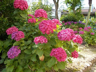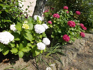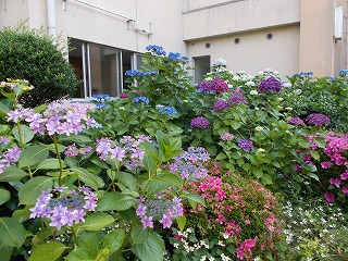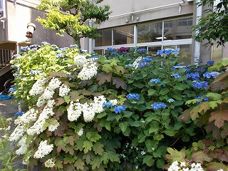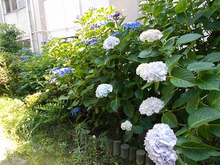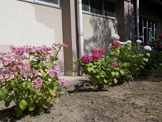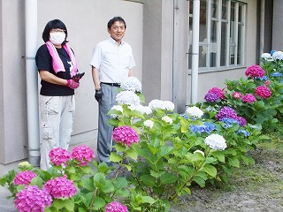 「先生、中庭の紫陽花がすごくきれいです」「そういうことに気づくみんなの心がきれいだね」と、そんな会話が聞こえてきました。もう一つうれしいことが、昨年度、支援をしていただいていた丹後先生が、長嶺先生とともに、朝からあじさいボランティアといて、草取り等をしてくださいました。