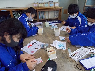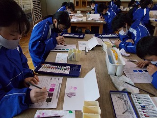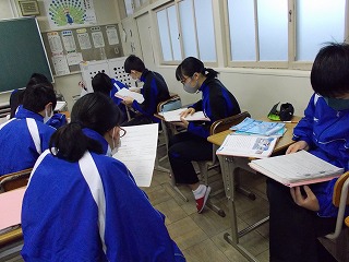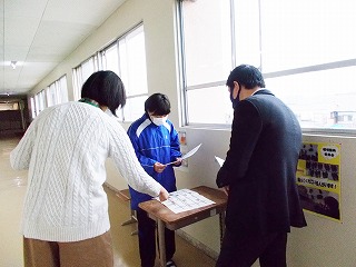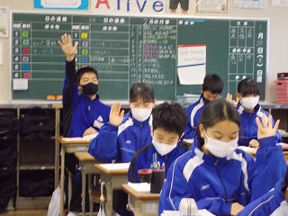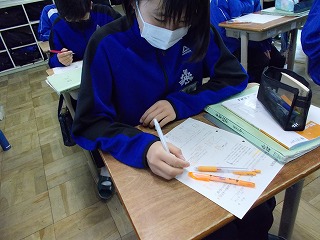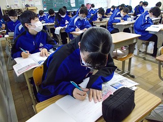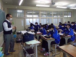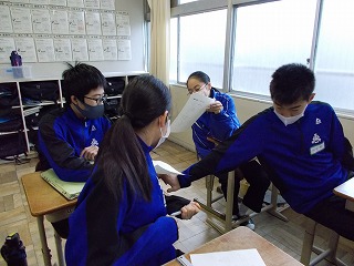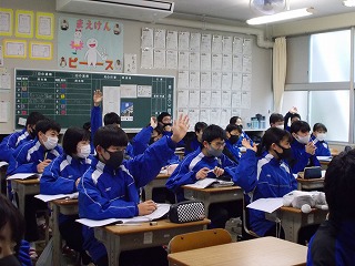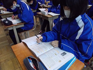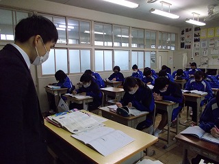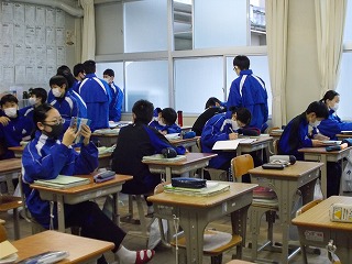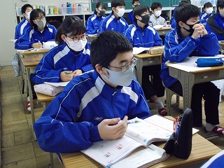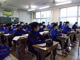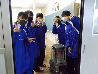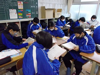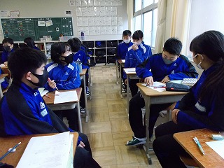 1年生、2年生は、学年末テスト前ですが「いつ感染症拡大で授業ができなくなっても大丈夫なように」と、危機感をもって授業に臨んでいる姿も見られました。また、グループでの話し合い活動ができないので、椅子の向きを変えて意見を伝える姿も見られました。休み時間になると、ストーブのまわりに集まって、笑顔で、小声で会話をしたり、自席で本を読んだり、仲間と会話したりする風景が見られるようになりました。温かい気持ちになりました。