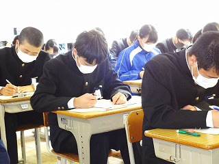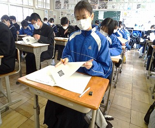 2年生の生活も残りわずかとなりました。3年生に向けて「高校受験を体験しようプロジェクト」を実施しています。3月17日(木)には「ミライ入試」と名付けて、実際の入試問題に取り組みました。「ミライ入試」の前には、事前指導として今年度の私立日程を見て、受験校を考えました。また、公立高校の群やグループの組み合わせを説明して、2校受検について理解を深めました。