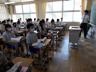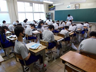 夏休みが明け、皆さんの元気な顔が見られました。体調を崩して、お休みされた皆さんもいますので、放送朝礼の内容を伝えます。「おはようございます。今日は、ある先生から聞いたことを話します。その先生が、夏休み前の授業で、生徒のノートを見るために教室を回っているとき、下に置いてあった生徒の水筒に足が当たって倒してしまいました。先生が『ごめんなさい』というと、生徒からは『先生、足、大丈夫でしたか』と返答があったそうです。すてきなやり取りですね。今、いろいろな制限がかかっていたり、熱中症の心配があったりする中、このようにさわやかなやりとりができると、一日が気持ちよく過ごすことができます。心がけたいです」