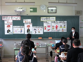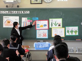 10月に引き続き、管理栄養士を目指している大学生の臨地実習の一環として、1年生の教室で給食指導を実施しました。朝食の大切さやカルシウムの必要性についての話がありました。