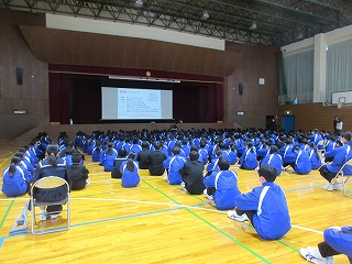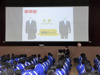 1時間目の開始前に「集会」を開催し、来年度から導入されるブレザータイプの標準服や校則見直しに伴う変更点などについて、生徒指導担当より1・2年生に向けて説明しました。4月からの佐屋中生も、素晴らしい集団であってほしいと思います。