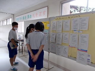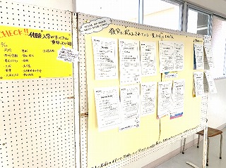 西昇降口前に、進路掲示板が設置してあります。現在は7月、8月に行われる私立高校の募集が増えてきています。見慣れない名前の学校もあるかもしれませんが、これを機に一度自分でその学校について調べてみたり、体験入学に参加したりしてみてはどうでしょうか?校舎や在校生の姿から学校の雰囲気が分かるかもしれません。ひょっとしたら「絶対にこの高校に進学したいから、今より勉強をもっと頑張る!」という気持ちになるかも!?(3年通信「おかげさまで。」より)
