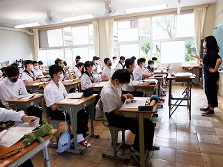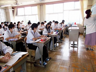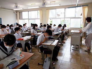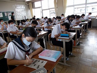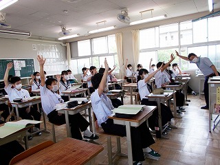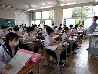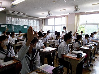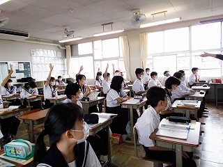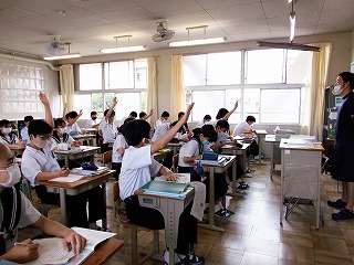 クラスでの授業を再開しました。前向き、マスク着用で大声を出さないなど、新しい生活様式での授業の様子です。でも、みんな手を挙げ、発言する様子も見られました。