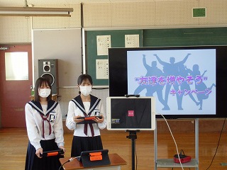 代議員をはじめとして、各委員会から前期の活動目標や活動計画について報告がなされました。報告を聞いた生徒たちは、タブレットで意見や質問、応援メッセージを送りました。