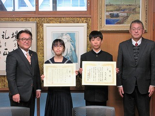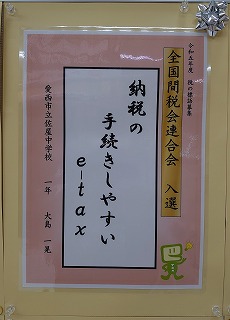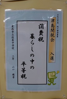 夏休みの課題であった「税の標語」が優秀と認められた生徒への表彰が行われ、津島間税会の会長より表彰表と記念品がが贈られました。