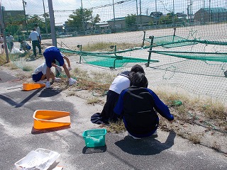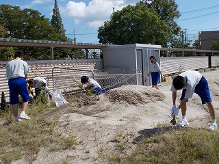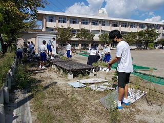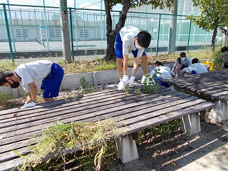 運動場まわりの草が元気いっぱいに育っています。夏休み後半から部活動もないため、伸び放題でした。掃除の時間に、学年精鋭の皆さんが、頑張ってくています。
