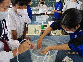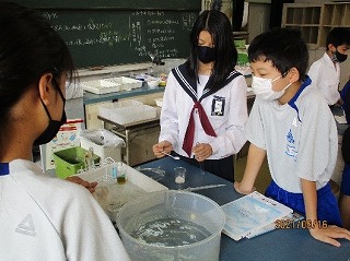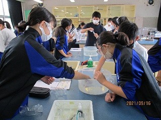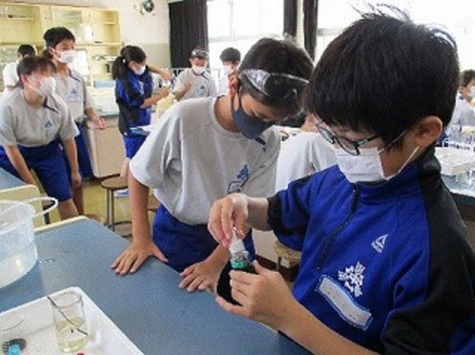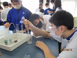 理科の授業では、気体の性質を調べる実験を行っていました。コロナ禍で実験を自粛してきましたが、密を避け、大声を出さずに短時間で行う対策を取り実施しました。迅速、かつ丁寧に実験に取り組む姿が見られました。