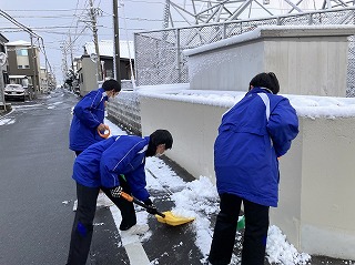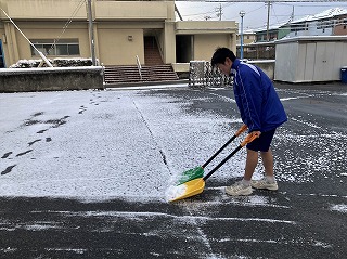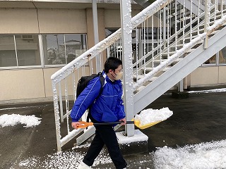 昨日からの雪が残り、登校時の影響が心配されましたが、通常通りに始業することができました。職員が、校門や昇降口付近の除雪作業を行っていると、いつもより早めに登校した生徒たちが手伝ってくれました。その気持ちと行動力が、とても素晴らしいと思います。ありがとうございました。