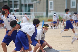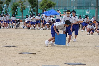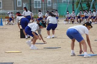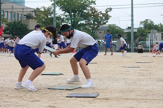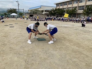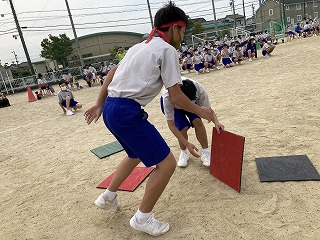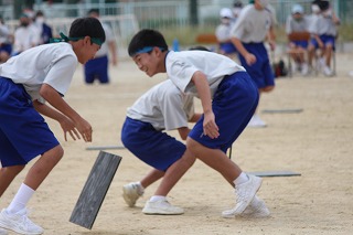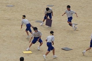 「わいわいスプラトゥーン」は、片面にブロック色、もう片面に黒色を塗った板を黒色面を上にしてグランドに散らし、「ヨーイ ドン」で、自分のブロック色の板をいかにたくさんひっくり返すかを競います。4回戦行いましたが、回を増すごとにやり方のコツをつかみ、ひっくり返した板をひっくり返されないように守ったりして、作戦を立てている人もいました。