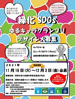 緑化委員会によるSDGsの取り組みが行われます。それに先立って、緑化SDGsゆるキャラグランプリが開催されます。先日、濱田先生と緑化委員の生徒が廊下にポスターを掲示してくれました。佐屋中の未来箱マスコット「時場礼太郎くん」「時場礼子さん」に並ぶ人気キャラクターになれるのでしょうか。12月3日(金)まで昇降口で募集を行っているので、どしどしご応募ください。先生の参加も可能なようですが、3年生教員は絵心のなさで有名なので、今回のグランプリは皆さんのセンスに託します。(3年通信「Advance」より)