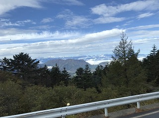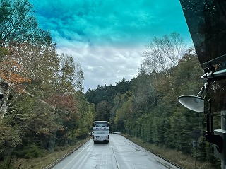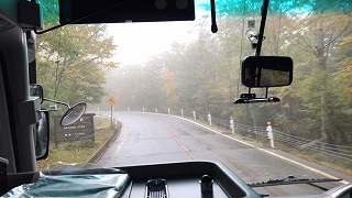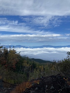 今朝まで降っていた雨の影響か、二合目あたりは霧がかかっていましたが、五合目に近づくにつれ青空がのぞき、車窓からは、紅葉した木々を見ることができました。