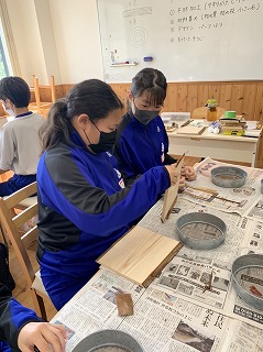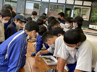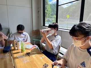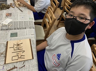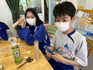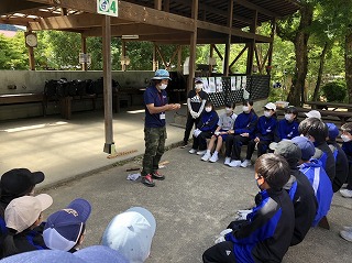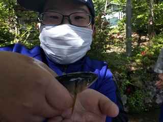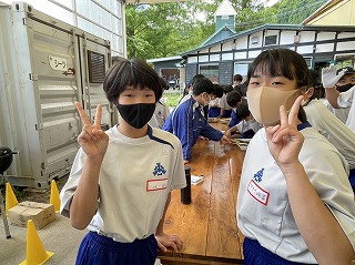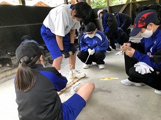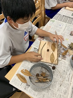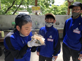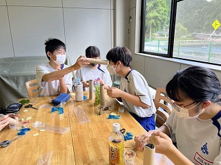 いよいよ野外活動最後の自然体験です。①魚つかみ取り・・・『獲ったどー』『獲った魚はありがたくいただきます』②火起こしクルミ・・・『自力で火をおこします』『キターーー』③食品サンプル・・・『はじめはまずそうですが…』『センスが大事です』『だんだんおいしそうになってきました』④万華鏡・・・『みんな上手です』『素材によって味があっていい感じです』⑤ネームプレート・・・『枝でデザインします』『文字や図柄を考えて作っています』
