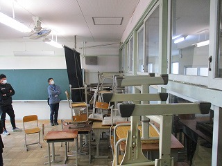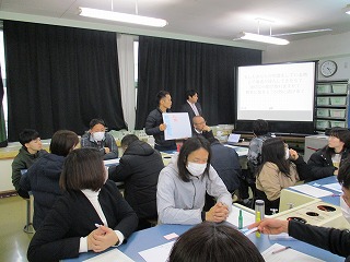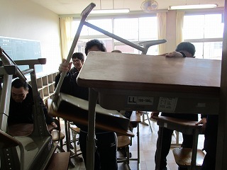 不審者が侵入したときを想定し、緊急時の安全確保、情報伝達、役割分担などについてグループ協議を行いました。その後、生徒の安全を確保するため、教室内でバリケードを設置する訓練を行いました。