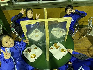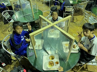 コロナ禍でなければ、自然園での夕食は、皆で鉄板を囲んで鶏肉や野菜を焼いて盛り上がるのですが、現在は、感染防止対策のため、一人分ずつの個別提供となっています。