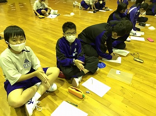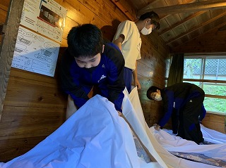 バンガロー内では、自分でシーツを敷いたり、毛布を準備したりと寝床の準備が進められ、ホールでは、加藤先生と濱田先生による「めざせ!Green consumer!」と題したSDGsについての学習会が行われています。