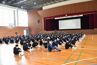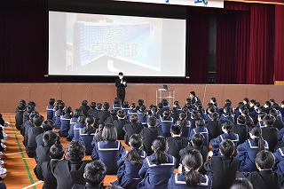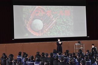 体育館で各部の部長さんから部の紹介があり、昨日と一昨日に部活動見学を行いました。学校の部活動だけでなく、地域の活動やクラブチームに参加する人もいるかと思います。中学生の時期は心身ともに大きく成長するときです。ぜひ、自分に合ったものを見つけて3年間続けてみてください。