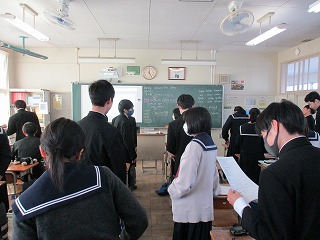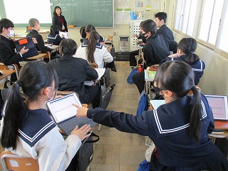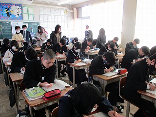 4時間目、現職教育研究の一環として、2-2の英語の研究授業を行いました。「Unit7 World Heritage Sites Read and Think②」という単元で、助動詞を用いた受け身の形・意味・用法について、個人で考えたり、グループで話し合ったりしました。