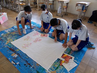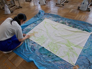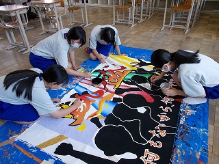 皆さんが心待ちにしている学校祭に向けて、制作部2・3年生の有志16人が、学校祭のテーマ旗制作を進めています。取りやめも検討されましたが、短時間で密を避け、換気をしっかり行うなどの対策をとって行うことになりました。少数精鋭、日替わりでの制作になるため、思うように作業が進められない状況ですが、本当に一生懸命に取り組んでいます。制作部の3年生は「個人ではなく、みんなで制作する喜びを感じることができました」「作品が出来上がる時がとてもうれしいです」と言っていました。完成が今から楽しみです。(生徒指導通信「サヤデー」より) また、各ブロックのシンボル旗についても、3年生の代表が心を込めて制作しています。