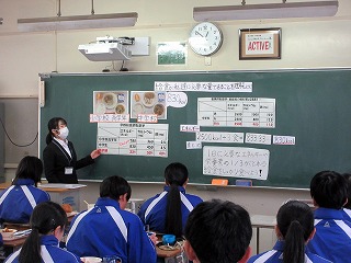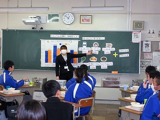 2年の2組と3組にて、大学生による給食指導が実施されました。「からだに必要なエネルギーやカルシウムなどの必要量」についての説明を受けました。