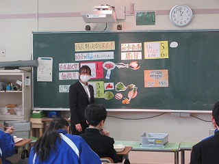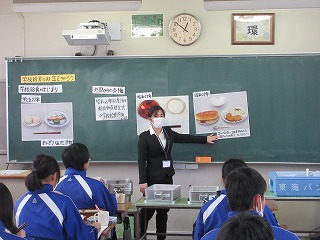 また、大学生による給食指導が実施され、「学校給食の始まり」や「成長期に必要な栄養素」についての説明を受けました。