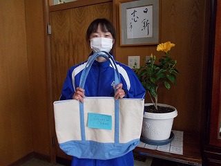 本校1年生の齋藤さんが、海部地区「技術・家庭科作品展」において、入賞しました。「教えてもらってエコバッグを作成しました。表にポケットを付けたことがポイントです」と、教えてくれました。家庭科の伊藤先生も「裏地もきれいにつけて丁寧に仕上げてあり、とてもよい作品です」と、絶賛していました。