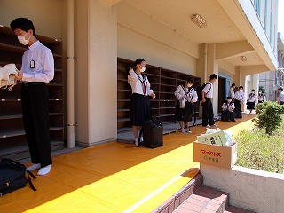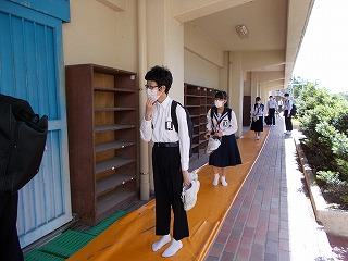 本日、学年別分散登校を行いました。久しぶりの登校とは思えないくらい、落ち着いて行動することができていました。「おはようございます」マスクをしていてもわかるほどの笑顔であいさつが交わされていました。体育館に入る時も、人と人との距離を確保し、一人ずつ消毒してから席についていました。先生たちも今日の日を迎えるにあたって、手洗い、消毒、動線の安全等、何回もシミュレーションを繰り返し準備してきました。1時間程度の滞在でしたが、皆さんに会うことができ、とてもうれしかったです。皆さんは、久しぶりの登校で疲れたことと思います。今日はゆっくり休んで、25日からの登校に備えてくださいね。待っています。