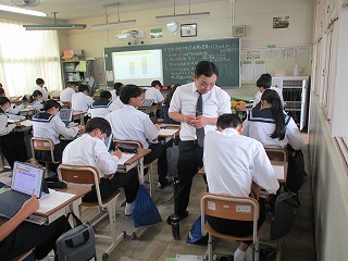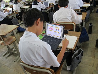 生徒は、タブレットで示された資料をもとに自分で考えたり、話し合ったりしながら真剣に取り組んでいました。