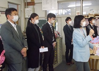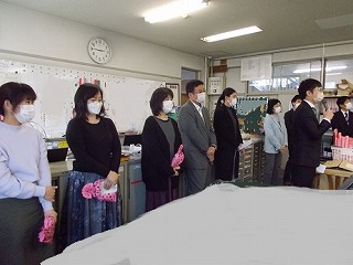 現在は、離任式を行っていませんので、ホームページでご紹介させていただきます。民枝先生は定年を迎えられ八開中学校へ。太田先生は蟹江町教育委員会へ。志治先生は甚目寺南小学校へ。各務先生は藤浪中学校へ。えりか先生は七宝中学校へ。俊彦先生は美和中学校へ。大崎先生は甚目寺南中学校へ。今尾先生は一宮南高校へ。彩乃先生は立田中学校へ。次の新天地でのご活躍をお祈りしています。大変お世話になりました。