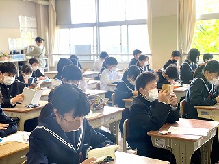 8時10分に各学年のフロアを覗いてみると、静寂に包まれた教室で黙々と本を読む皆さんの姿がありました。今年度も、佐屋中学校では8時10分から朝読書に取り組んでいます。「朝の読書推進協議会」の調べによると、朝読書を実施している学校は全国で88%だそうです。多くの学校が取り組む朝読書にはどのような効果があるのか調べてみると、ストレス解消・集中力アップ・コミュニケーション能力の向上などたくさん出てきました。たかが15分、されど火~金まで続ければ1週間で1時間、1か月で20時間も読書をすることになります。毎朝有意義に過ごすためにも、ぜひ主体的に取り組んでほしいと思います。(生徒指導通信「サヤデー」より)