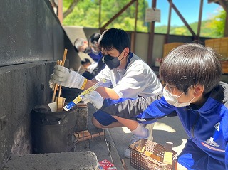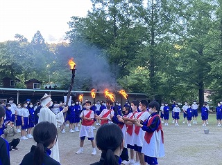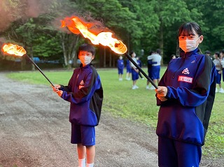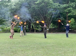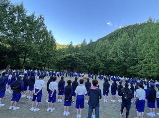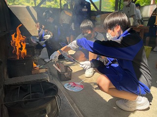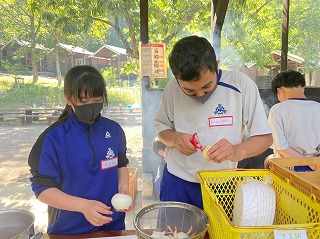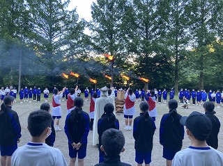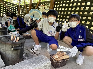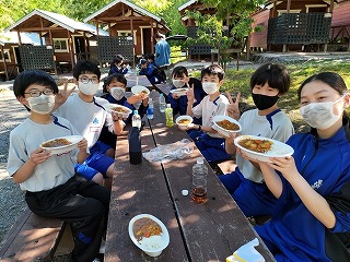14時、夕食のカレー作りを開始しました。ピーラーで皮をむいたり、火をおこしたり、みんなで協力して美味しいカレーが出来上がりました。食べるとすぐに後片付けが始まりました。黒いすすがなかなか落ちなかったり、道具が別の班に交じってしまったり、またまた、みんなで協力して片付けを終えました。日も傾き、いよいよお待ちかねのキャンプファイヤーです。詳しい様子は明日のホームページで!(つづく)