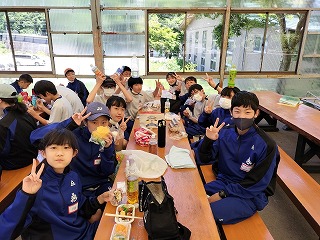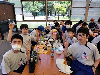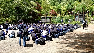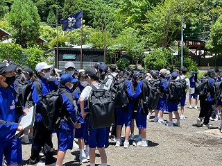 晴れ渡った空のもと、1年生は、岐阜県郡上八幡自然園へ野外活動に出発しました。10:30に自然園に到着し、その後、入所式が行われました。