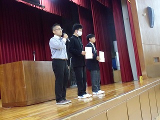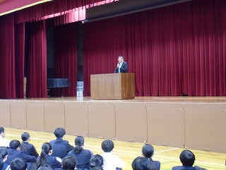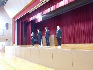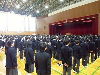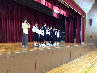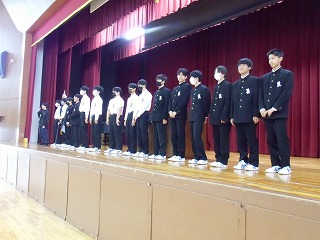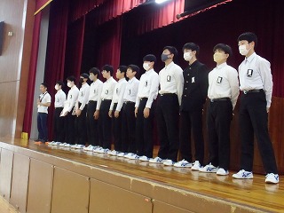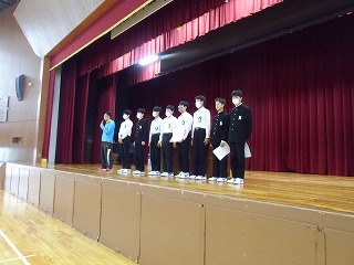 体育館にて全校朝礼を行いました。校長からは、クラブチームで活躍した生徒の紹介や新しい道の駅の名称を考案した生徒の紹介がありました。また、本日から始まる教育実習生の紹介も行いました。その後の