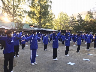 6時30分に起床した生徒たちは、栗の木広場に集合して「朝の集い」を行いました。