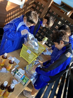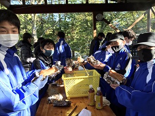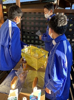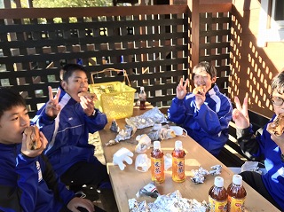 その後、朝食づくりの食材を受け取り、炊事場へと移動しました。メニューは、牛乳パックを利用して焼き上げるホットドックです。焼き上がったグループから、バンガローのテラスで食事を始めていました。