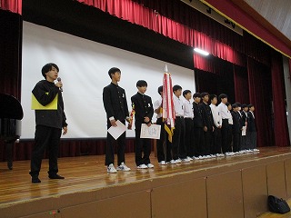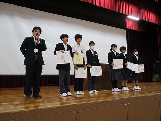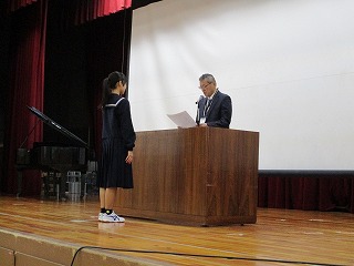 全校朝礼を行いました。まず、書写作品コンクールに入選した生徒の表彰を行いました。その後、校長からは、この時期の夕方は交通事項が多発することから、下校後の生活の仕方について特に気をつけてほしいとの話がありました。