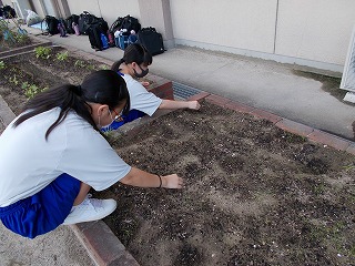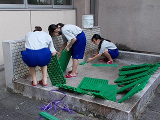 ボランティア部は、どんな活動をするかを話し合い、校内でのボランティアに取り組んでいます。1年生は、南校舎前の花壇の草取りや水やりを行っています。2年生以上は、拠点となる部室をつくるため、倉庫だった部屋をきれいに片付け、掃除をしています。「お願いしたら、ボランティアを受けてくれますか」と尋ねると、笑顔で「はい、大丈夫です」と返ってきました。