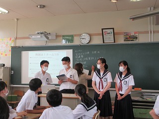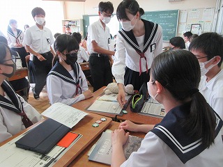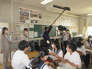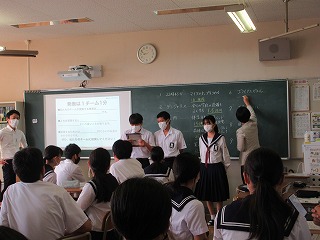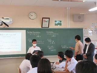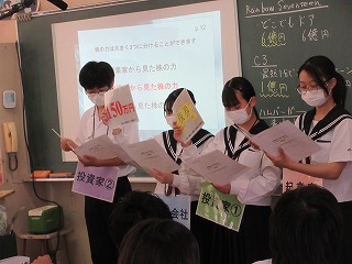 「起業家」「投資家」「社会」から見た株の力について、実践的に学びます。生徒は「起業家」「投資家」に扮し、チームで考えた事業の魅力を1分でアピールし、投資家から資金を集めたり、事業の将来性を見定めて投資をしたり、資金調達の疑似体験をしました。さらに「起業家」「投資家」「証券会社」に分かれたロールプレーイングで、投資する側、される側を演じながら事業資金の流れや様々な人たちの関わりを学びました。メーテレさんの取材もありました。