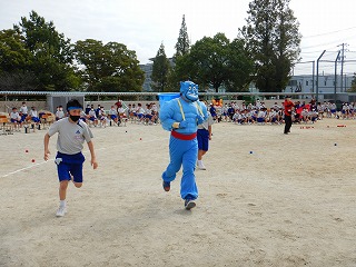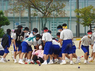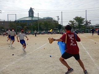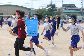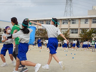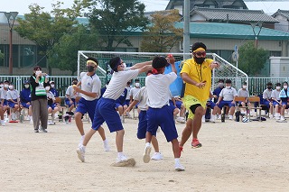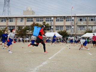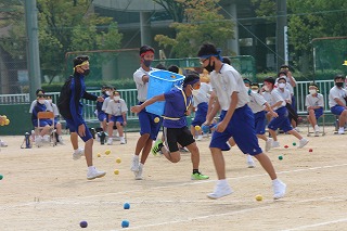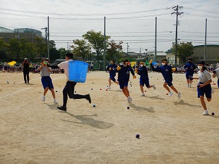 先生が背負ったかごをめがけて1分間で玉を入れます。先生の体力、機敏さなどに合わせて点数が加算されます。先生たちも、仮装、水鉄砲、グローブ、SPをつけるなどして応戦しましたが、生徒たちの力はすごかったです。