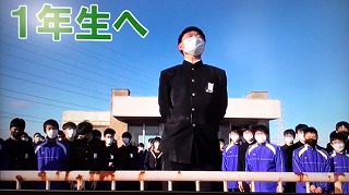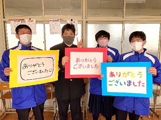 2月24日(木)に3年生を送る会が開催されました。3年生にとっては、笑いあり涙ありの幸せな時間となりました。動画では、部活動の後輩たちからのメッセージ、2年生までお世話になった先生からのメッセージ、1,2年生の皆さんからの出し物、3年生の先生たちからのメッセージが上映されました。そして、3年生からは、少し前に録音した合唱とともに後輩の皆さんへ感謝の思いを伝えました。しかし、それだけでは終わらないのが3年生。さらに、先生たちと3年生の生徒での共同作成「にんげんていいな」のミュージックビデオで全校を笑いに包み、この会を閉じました。1,2年生の皆さん、生徒会の皆さん本当にありがとうございました。(3年通信より)