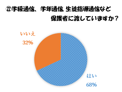 2年生を対象にしたアンケート調査の中に、「学級通信、学年通信、生徒指導通信などを保護者に渡していますか?」という設問がありました。その結果を見て少し残念でした。通信を渡している生徒の割合が70%未満ということでした。担任の先生や学年主任の先生などが作成している各種通信は、生徒や保護者の皆さんに学校の様子をお知らせするものです。生徒の皆さんは、学校で配布された各種通信を必ず保護者の手元に届くようにしてください。(生徒指導通信「サヤデー」より)