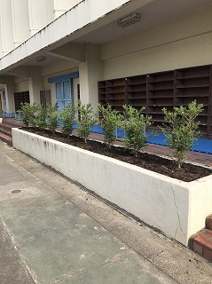 3月に体育館南の花壇に植えていただいた「キンメツゲ」が大きくなってきました。ここは、ずっと草が生えていましたが、体育館を利用する人が、南側でほっとできるようにと、地域の方にお願いをして整えていただきました。緑がきれいです。