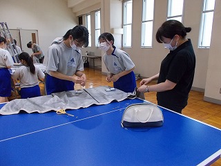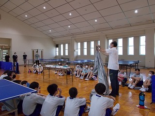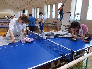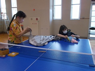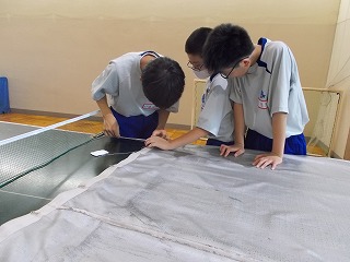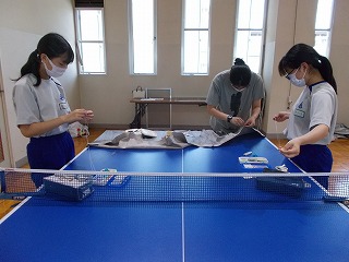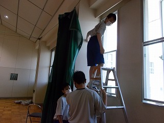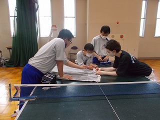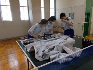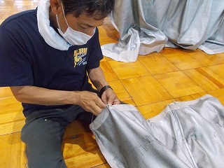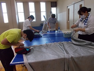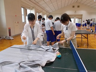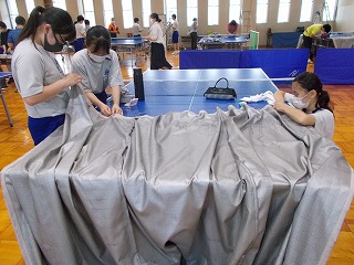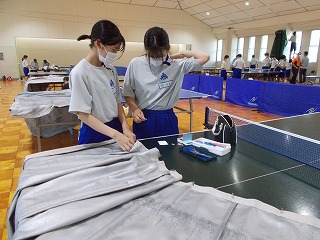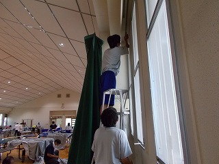 7/30(土)、経年劣化もあって、武道場のカーテンがレールから外れているものが多くなっていました。そこで「自分たちの学校は自分たちの手でよりよくしよう」と、保護者、地域の方、卓球部の生徒、OBがカーテンの補修をしてくれました。「カーテンを直してくださり、とてもよい環境で部活動ができます。ありがとうございました」とお礼の言葉がありました。
